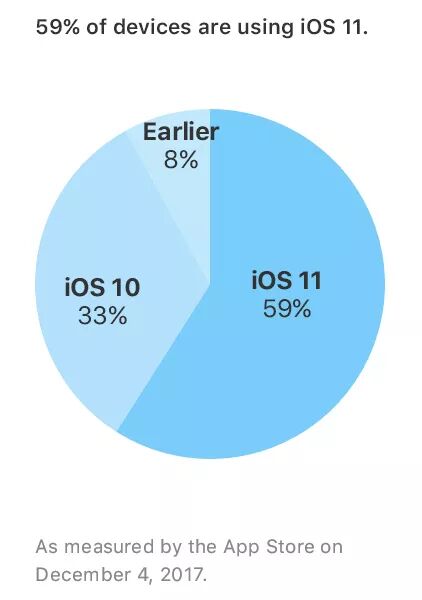根据苹果官方数据来看,截止到 2017 年 12 月 4 日为止,有 59% 的 iOS 设备升级为 iOS 11 系统。此外,iOS 10 系统机型安装率占比为 33%,其他版本是 8%,该统计覆盖了大多数的苹果移动设备,包括所有型号的 iPhone 和 iPad。可以看出,还有近一半用户仍在使用旧系统。