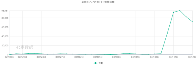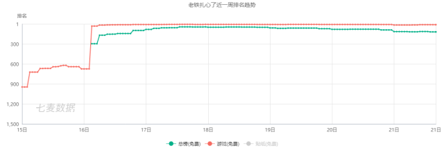 我们从七麦数据得到的 App Store 榜单数据显示:在 3 月 16 号以前,《老铁扎心了》只在游戏类榜单上处在 6、700 名开外的位置。在总榜上甚至都看不到这款 App 的身影(1500 名开外)。但是在 16 号以后,排名突然飙升,最高升到了游戏榜第九名!
