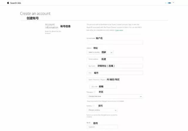 创建账号页面包括账号信息和主要账户。账号信息里需要填写账户名、地址(要具体到街道,更详细的地址为选填项)、时区、货币、税号。