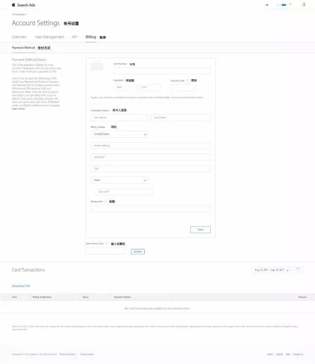 进入到账号设置之后再点击 “Billing”,即可以进入到支付方式页面。支付方式页面需要填写卡号、银行卡的有效期、密码、持卡人信息、邮箱,以及优惠码。