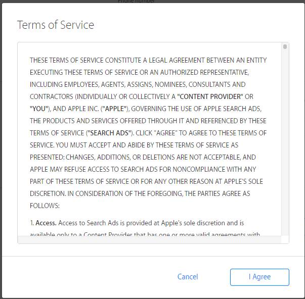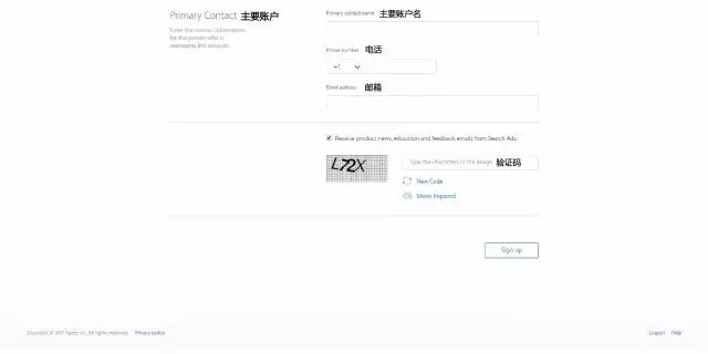 主要账户里需要填写账户名、联系电话、邮件,并默认勾选了「我愿意接受关于 Search Ads 的新闻、功能更新、升级的推送」,最后填写验证码即可。