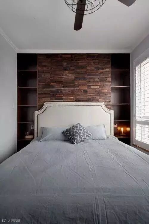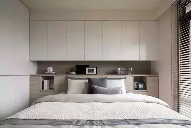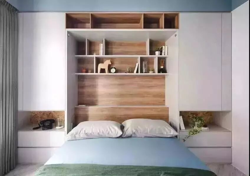 床头背景墙作为收纳来使用是非常方便的,而且还可以把床头柜也给整合进柜子当中,只需要在左右留出两个开放式的格子就可以了。