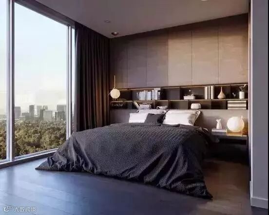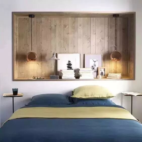 简约一些的就可以只在床头的两侧做上柜子,中间留出空间摆放零碎物品和绿植,床头上方可以摆放隔板,放几本书,方便晚上阅读。