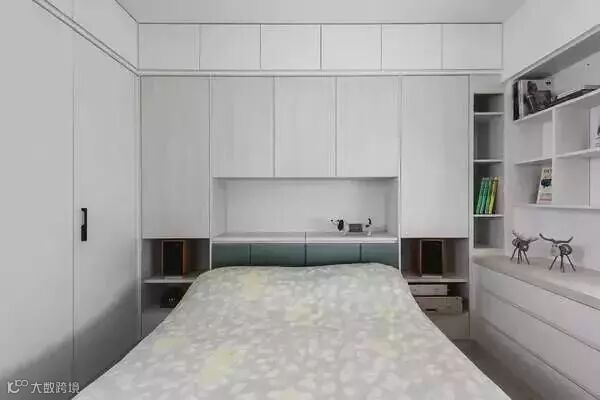 橱柜床头的柜子之外,床本身也可以作为收纳来使用,小户型卧室做个榻榻米床,组合衣柜和开放式的搁架,整体感又强又实用。