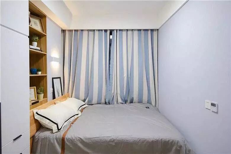 小户型卧室也可以把床放在其中一侧,那么另一侧就可以选择做一板到顶的柜子,给柜子搭配一些开放式的格子,避免太过压抑。