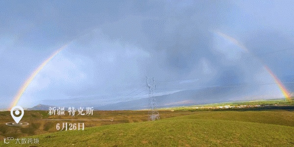 6月26日傍晚,新疆伊犁,雨后天空出现双彩虹,宛如彩带横跨整个旱田