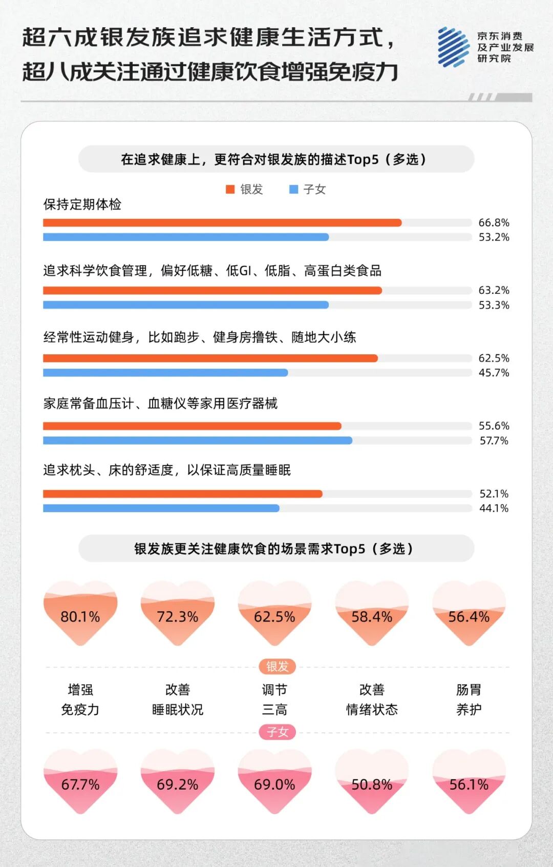 对银发族而言,科学饮食、运动健身、高质量睡眠是进行健康管理的主要途径,他们更偏向通过生活方式来主动提高健康指数;但在子女认知中,常备家用医疗器械(57.7%)以及保健品、滋补品(51.9%)更受重视。这背后,是部分子女因工作忙碌,习惯通过“购买硬件产品”为长辈健康兜底,对长辈们“主动运动、饮食调理”等日常健康行为的感知度相对滞后。
