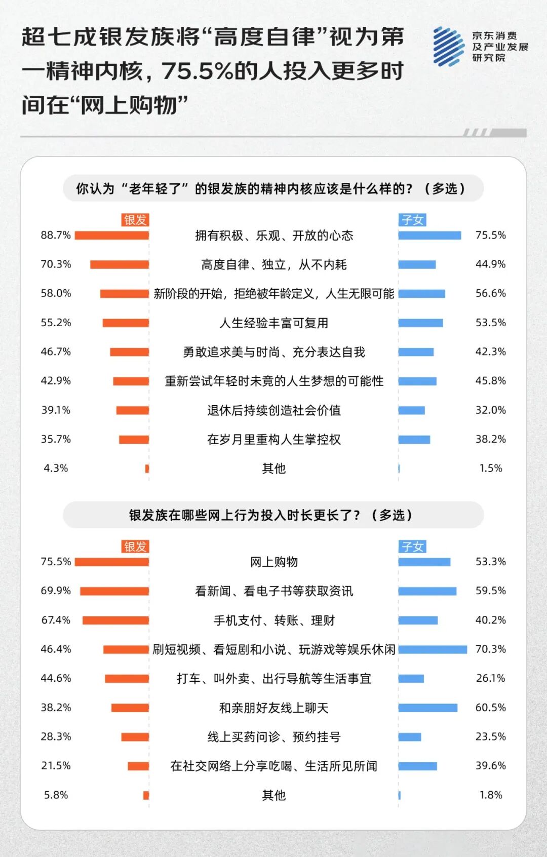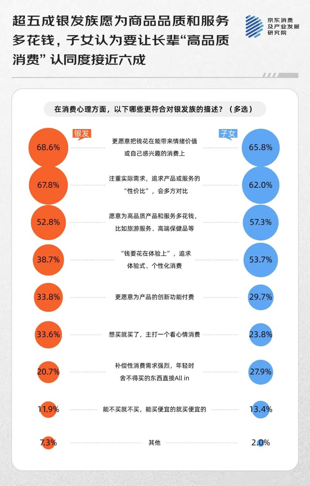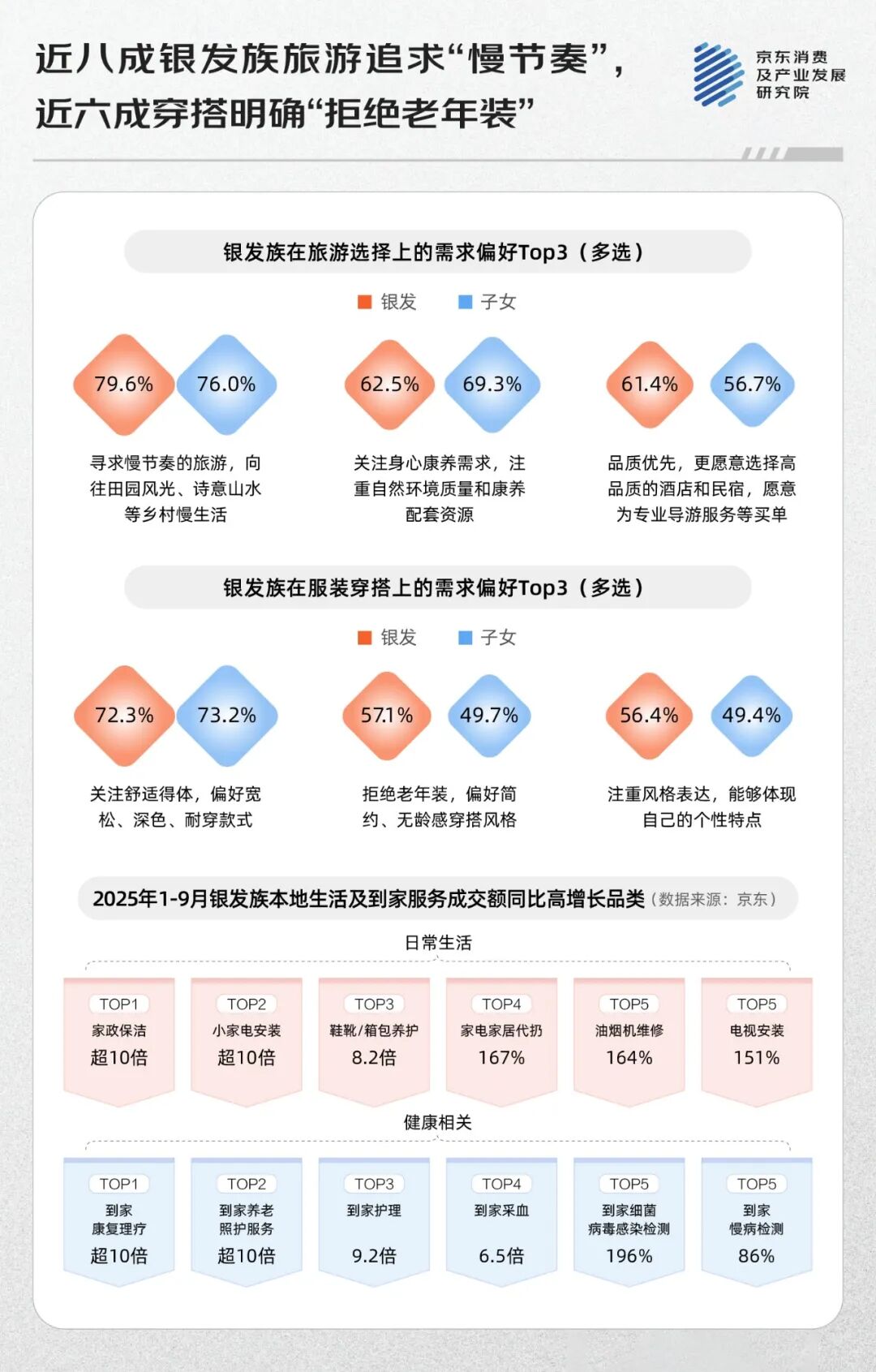 银发族追求品质消费, 52.8%的人愿为旅游、高端保健品等高品质产品付费,38.7%追求体验式消费,银发族拒绝将就,愿为年轻感买单,他们穿搭偏爱“无龄感设计”(57.1%)、旅游追求 “深度体验”(50.4%)、服务消费倾向“花钱换时间”(49.3%),京东数据显示,银发族智能家居、旅游产品、时尚美妆类消费显著增长。