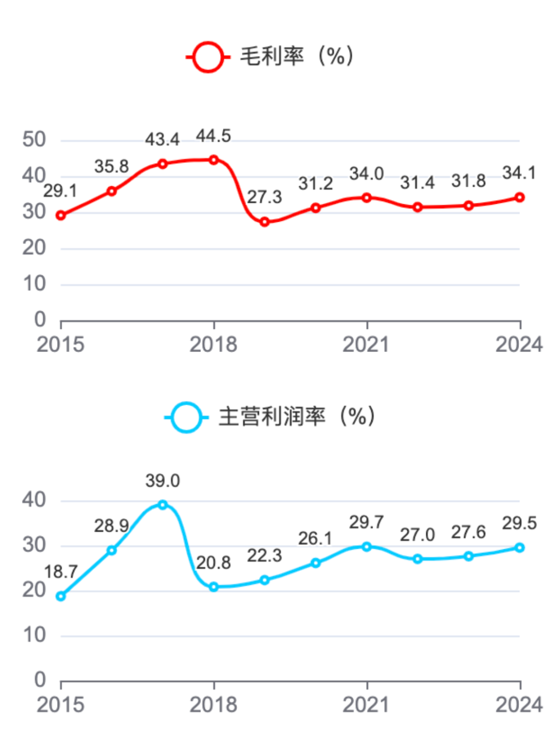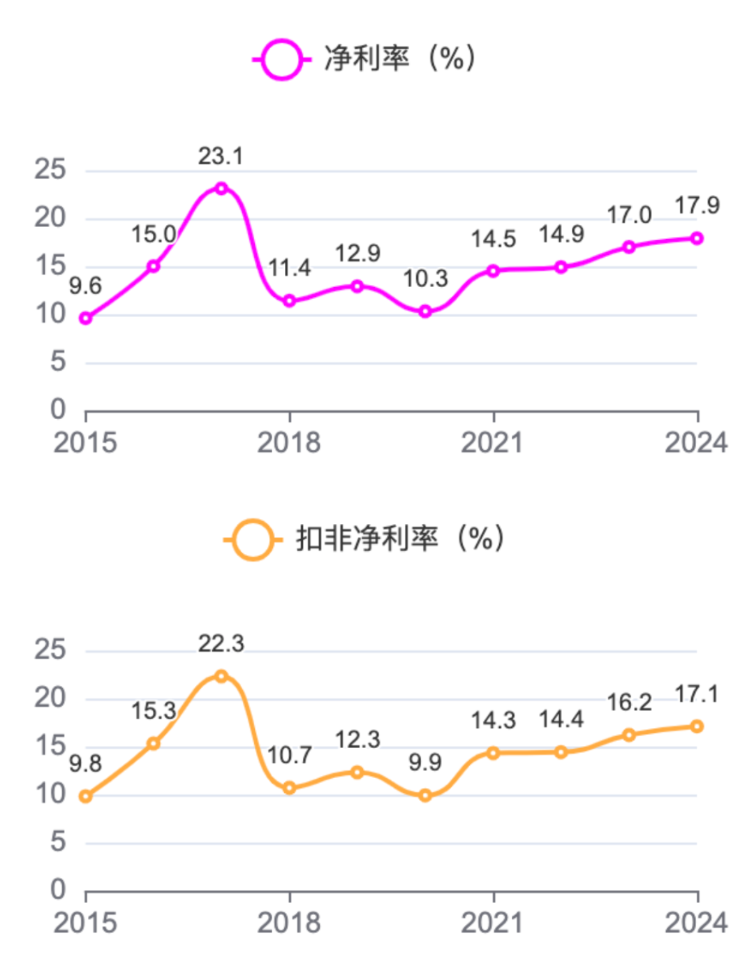 净利率和扣非净利率与主营利润率的波动趋势一致,2024年分别达到17.9%和17.1%。近年整体来说有增长的趋势,数值也超过了15%,表现也不错。