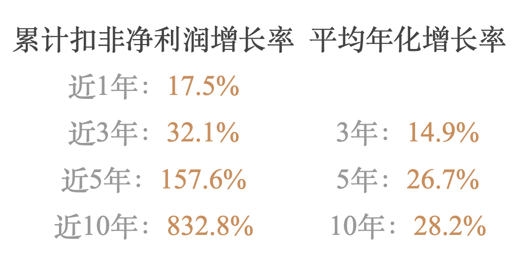 回到十年年报数据。扣非净利润近十年的平均年化增长率达到了28.2%,近一年为17.5%,始终保持两位数增长,增长还是很不错的。