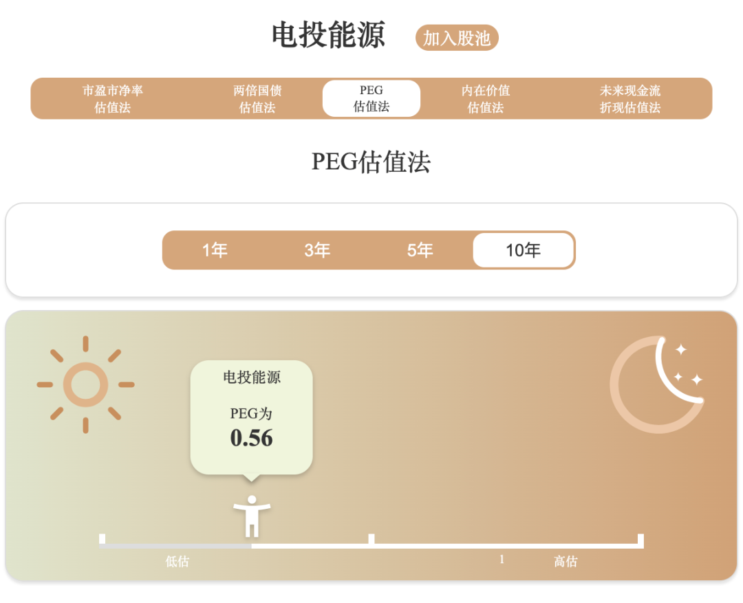 用PEG估值法计算,电投能源PEG值为0.56,小于1。也说明相对低估。