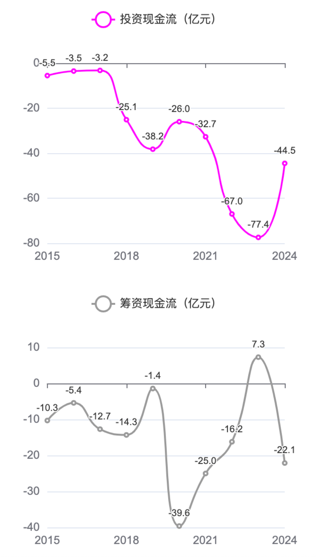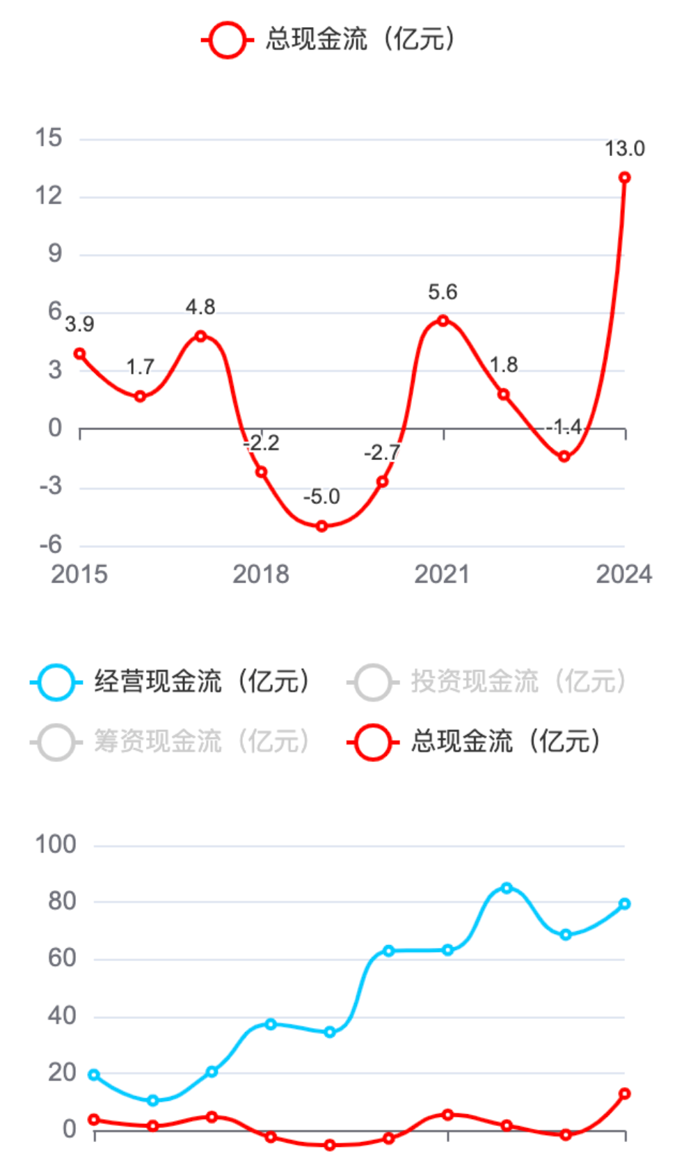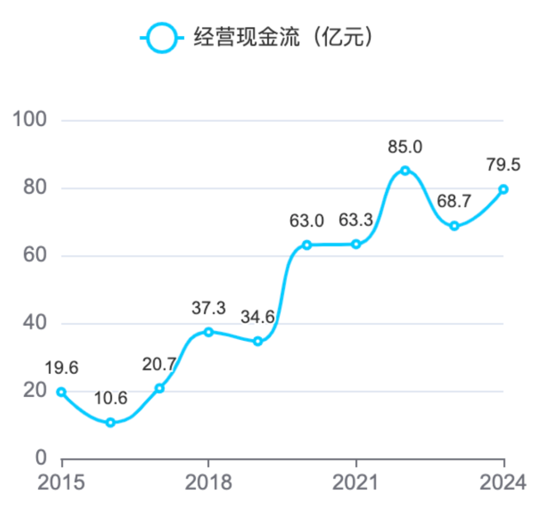 1、经营现金流净额。总体呈波动中增长的趋势,从19.6亿元增长至79.5亿元,表明公司的核心经营业务创造现金的能力不断增强,经营活动的现金流入较为充足,为公司的持续发展提供了坚实的资金保障。