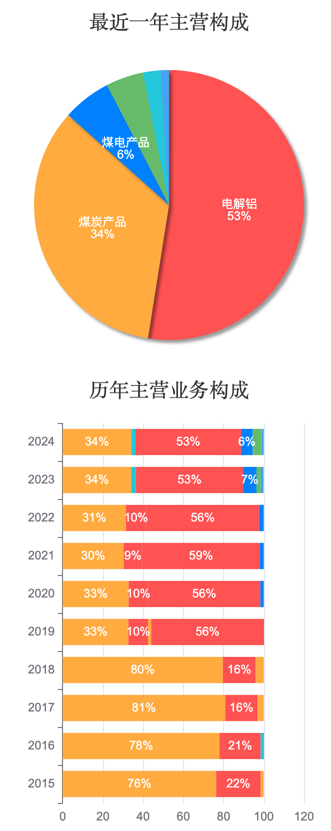 电投能源目前电解铝业务占比最大,达到53%,煤炭产品占比34%,煤电产品占比6%。回顾历年主营业务构成,2015 - 2018年煤炭产品在主营业务中占据主导地位,占比均超过76%。但从2019年开始,公司通过收购内蒙古霍煤鸿骏铝电有限责任公司,正式切入电解铝领域,电解铝业务成为了主要业务。