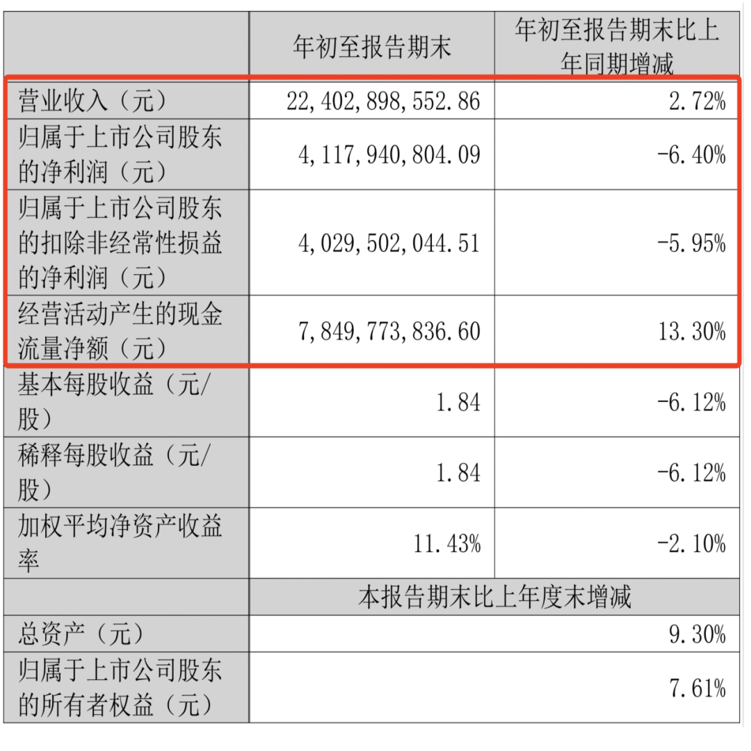 根据2025年三季报数据,公司前三季度实现营业收入224.03亿元,同比增长2.72%,延续了近十年来的增长态势。然而,归属于上市公司股东的净利润为41.18亿元,同比下降6.4%,扣非净利润40.3亿元,同比下降5.95%,盈利在下滑。