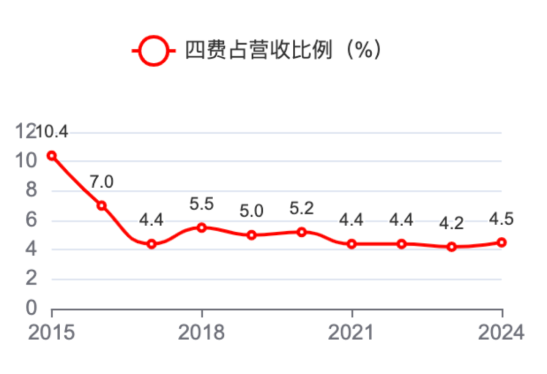 四费占营收比例总体呈下降趋势,2024年4.5%。占比很低,有效降低了费用支出对利润的侵蚀。