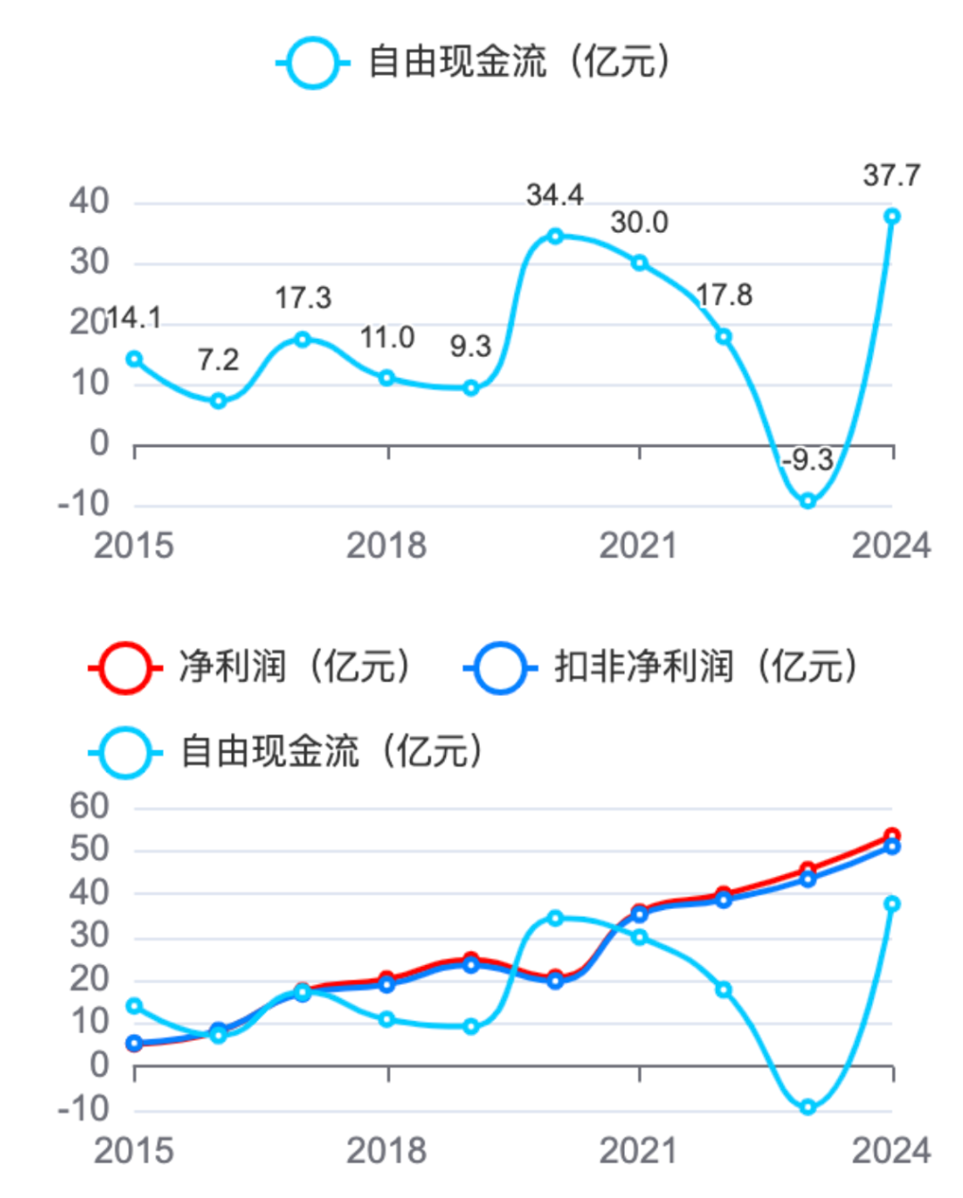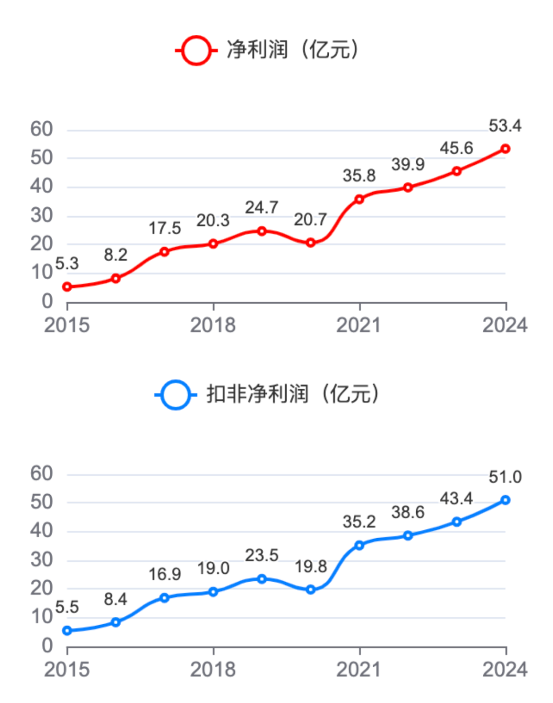 净利润方面,从2015年的5.3亿元增长至2024年的53.4亿元,扣非净利润从5.5亿元增长到51亿元。两者整体趋势一致,均保持增长。