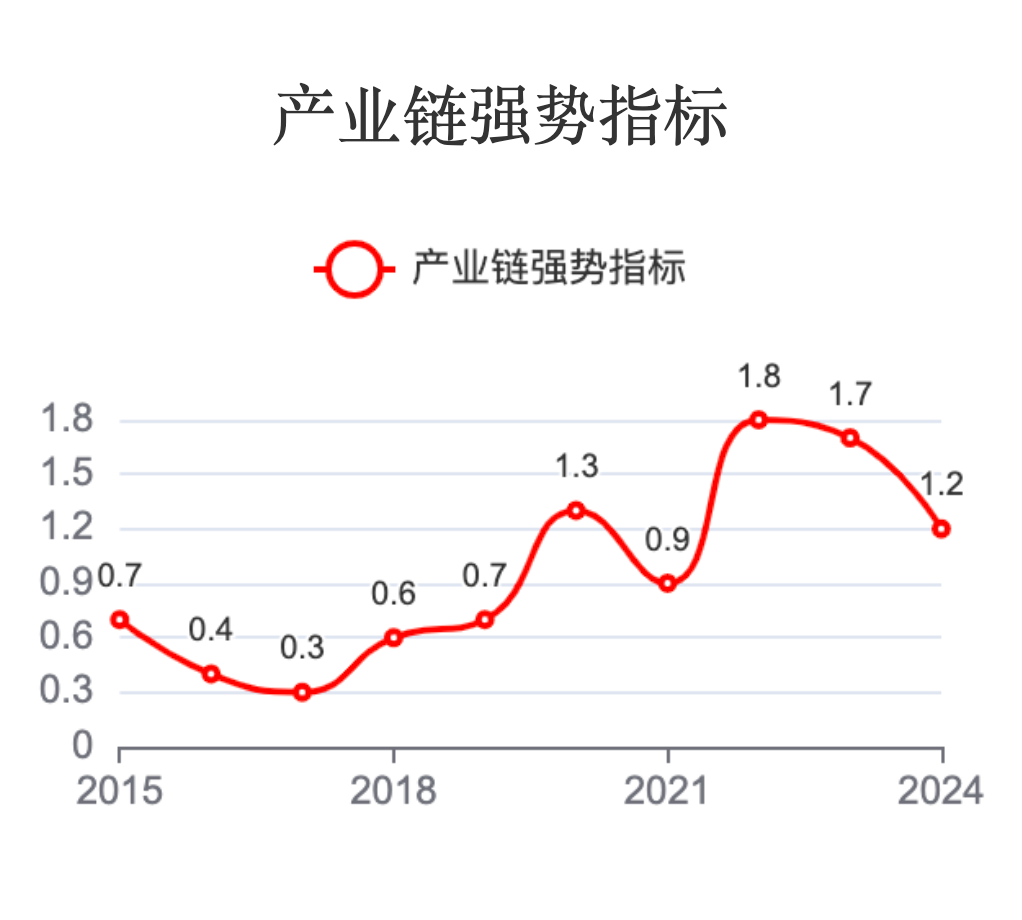 产业链强势指标波动较大。该指标反映了公司在产业链中的话语权。近年多数时候还是大于1的,也还不错。