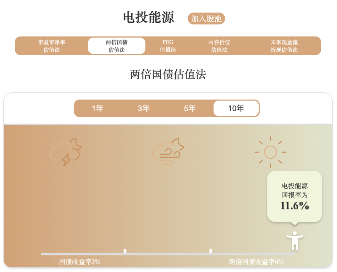 用两倍国债估值法计算,电投能源回报率为11.6%,高于两倍国债收益率标准6%。说明相对低估。