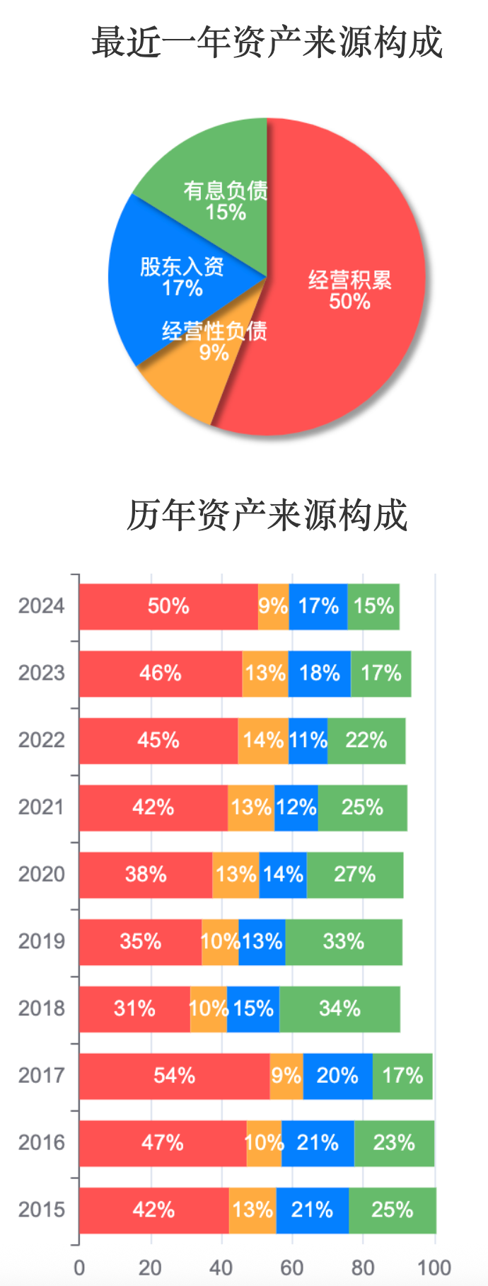 资产来源构成:2018年以后,经营积累逐年增加,2024年达到50%。这表明公司通过自身生产经营活动积累了大量资产,反映出公司核心业务的稳健性。