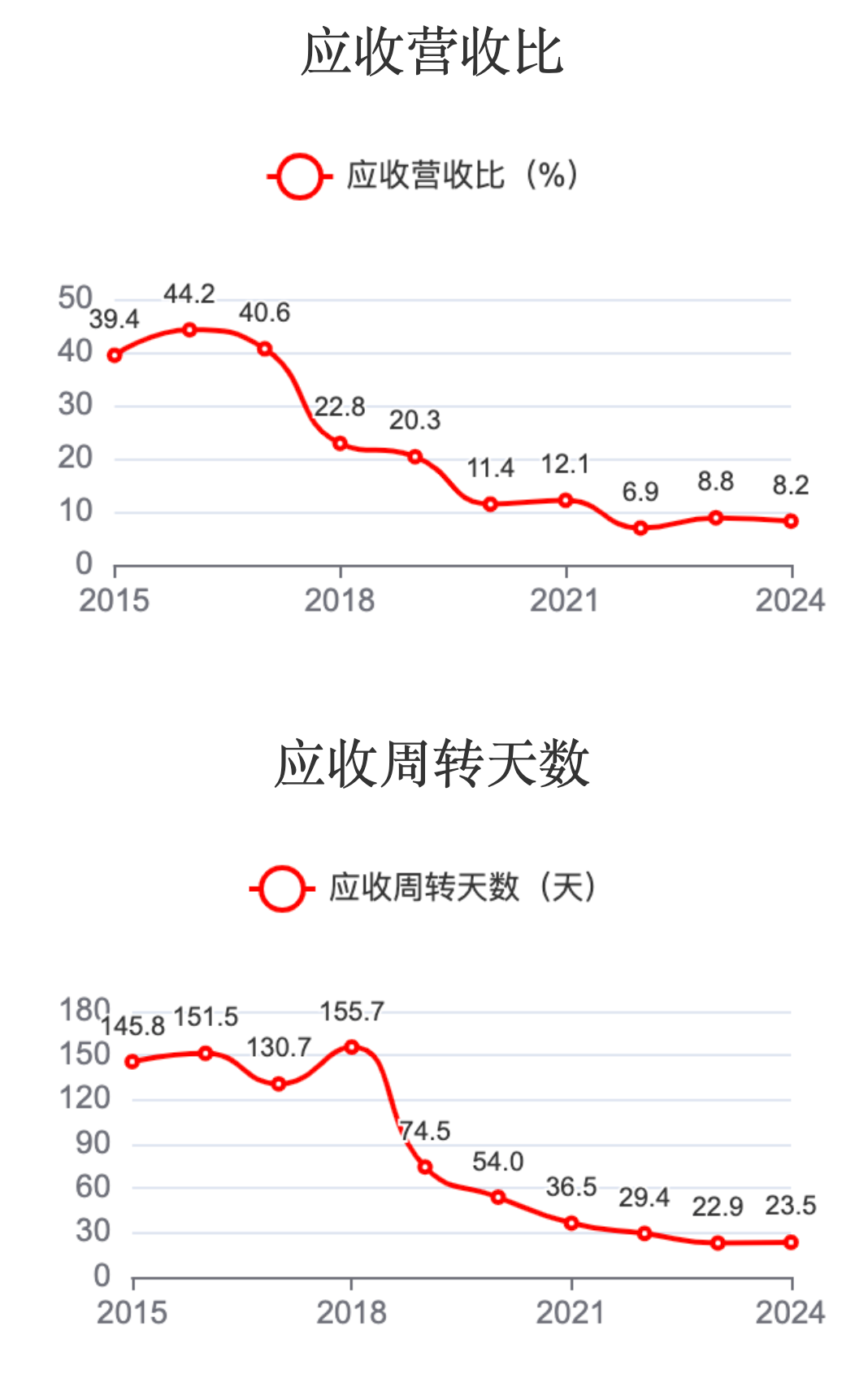 应收营收比下降至8.2%,应收周转天数缩短至23.5天。在应收账款管理方面取得了良好的效果,收款速度加快,应收账款回收风险降低,不错。