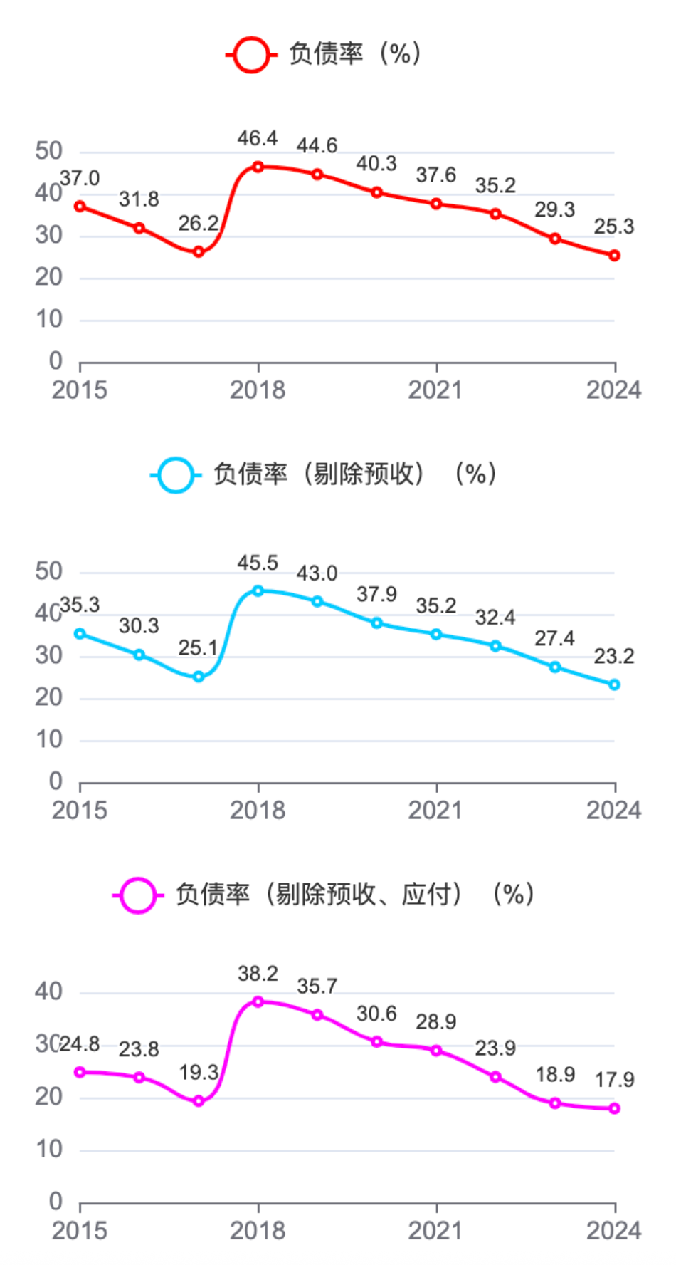 负债率从2018年之后持续下降,2024年为25.3%。剔除预收、应付后的负债率进一步降低到17.9%,很低。