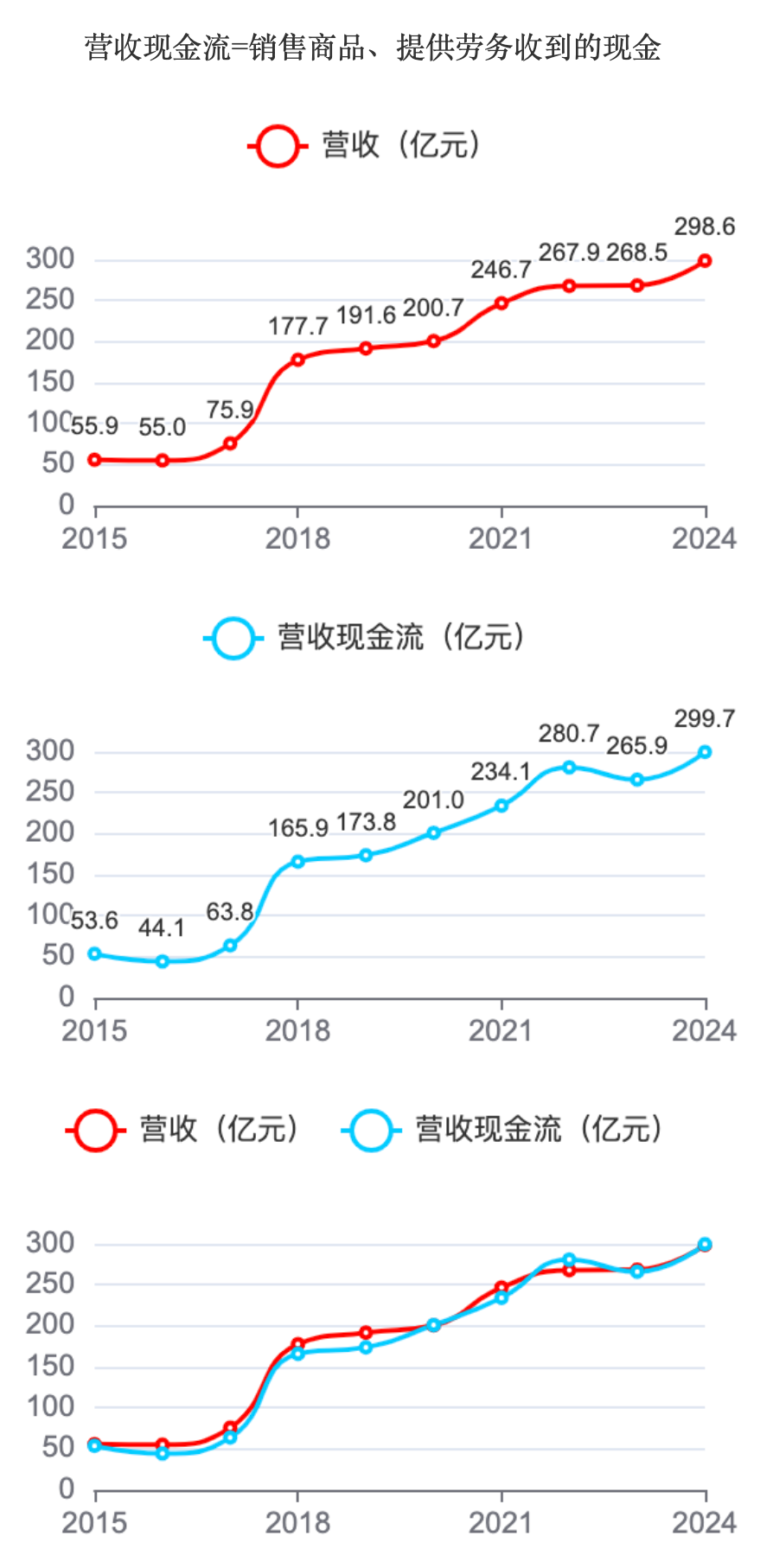 2015 - 2024年,电投能源的营收呈现稳步增长态势,从55.9亿元增长至298.6亿元。营收现金流也同步增长,从53.6亿元增长到299.7亿元,且营收现金流与营收曲线基本重合,说明营收含金量较高,收款能力较强。