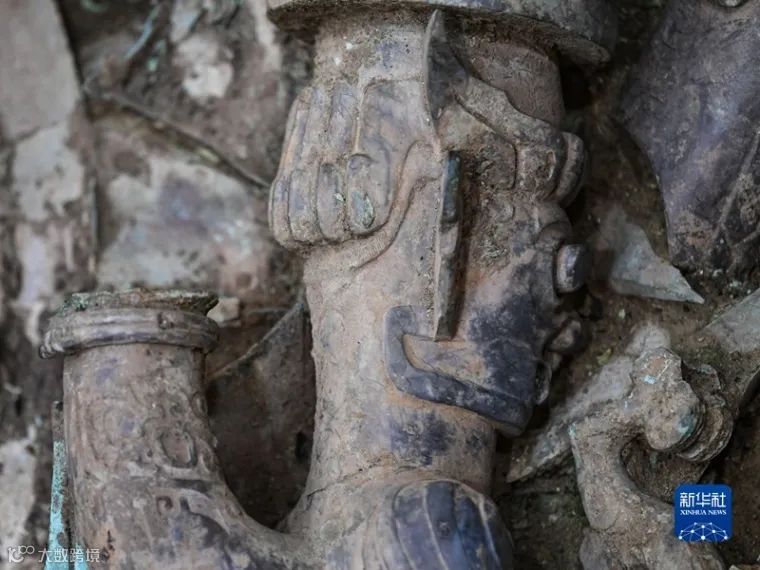 这是在三星堆遗址8号“祭祀坑”拍摄的顶尊蛇身铜人像局部(6月1日摄)。新华社记者 王曦 摄