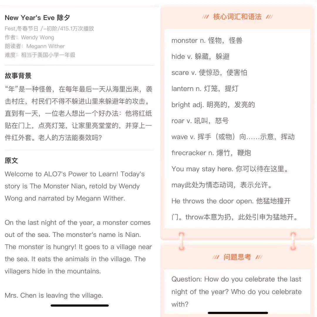 每个故事都配有音频,包含英语原文、中文故事背景和核心词汇。