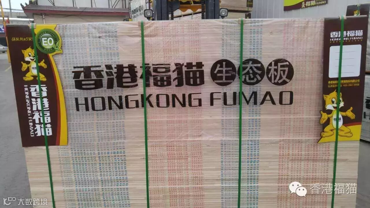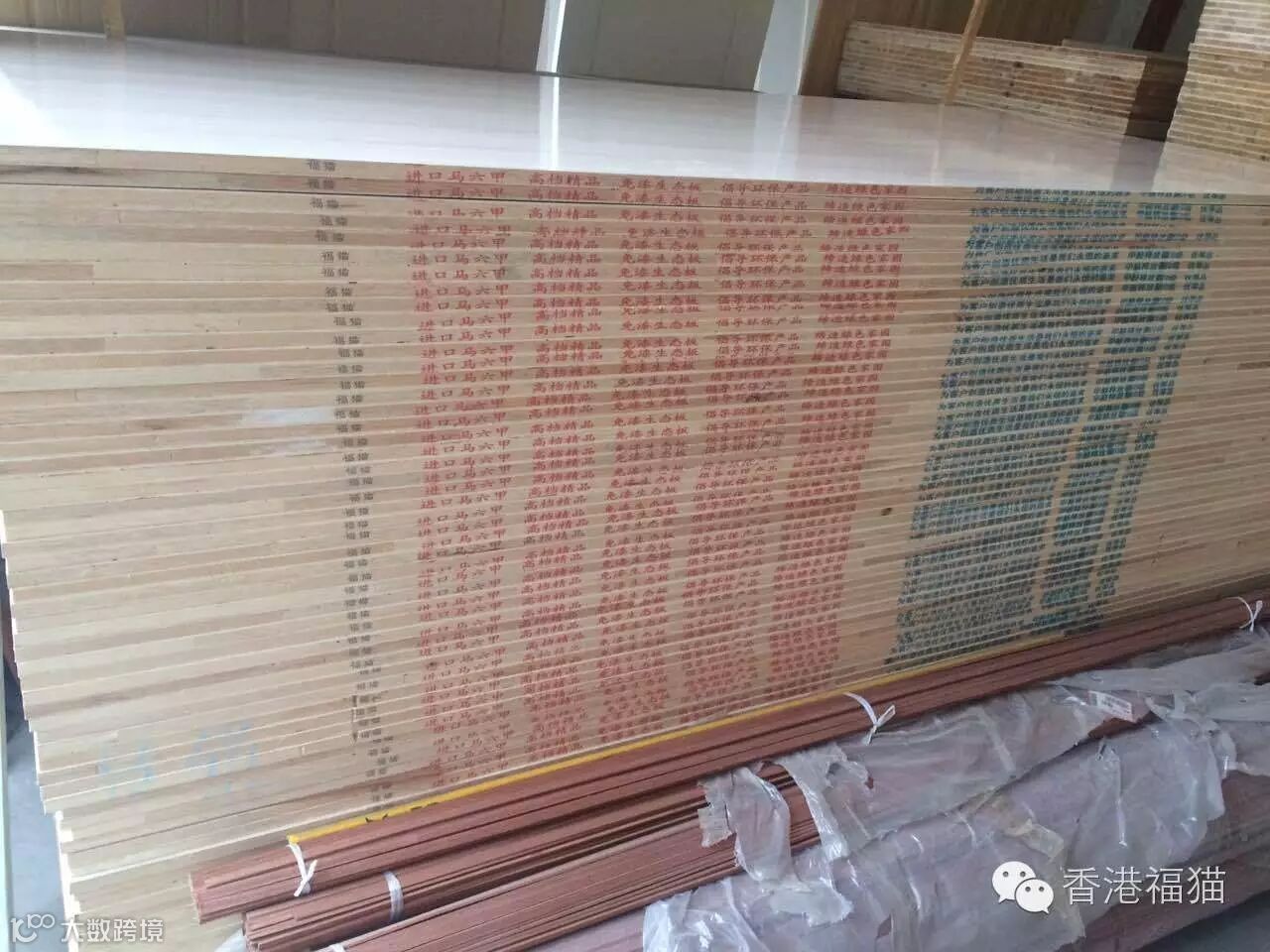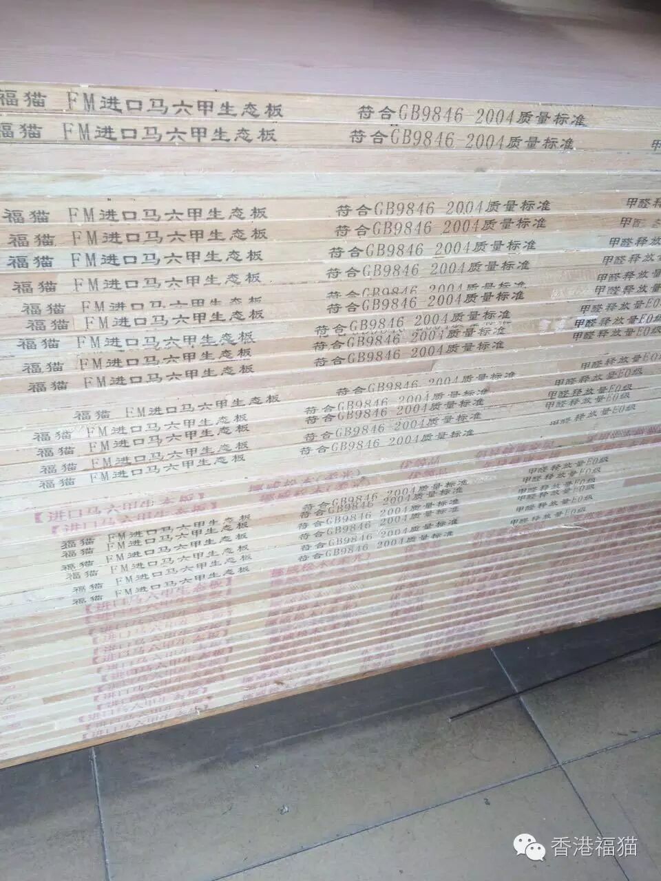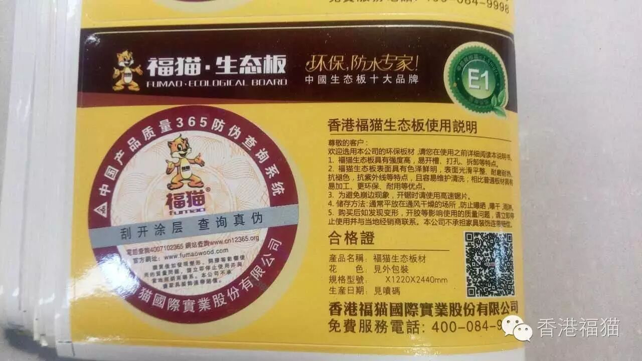 从两图对比中,我们可以看到正品的香港福猫板材上的字体是红蓝两色,并没有黑色,而且字体内容也不一样。