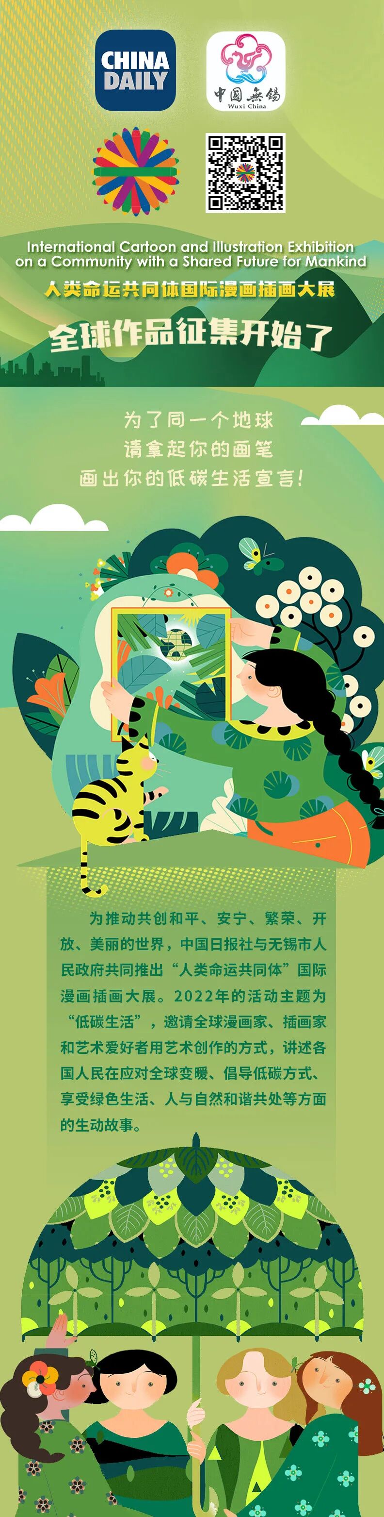 由中国日报社与江苏省无锡市人民政府联合启动的以“低碳生活”为主题的“人类命运共同体”国际漫画插画大展(2022)全球作品征集活动开始啦!