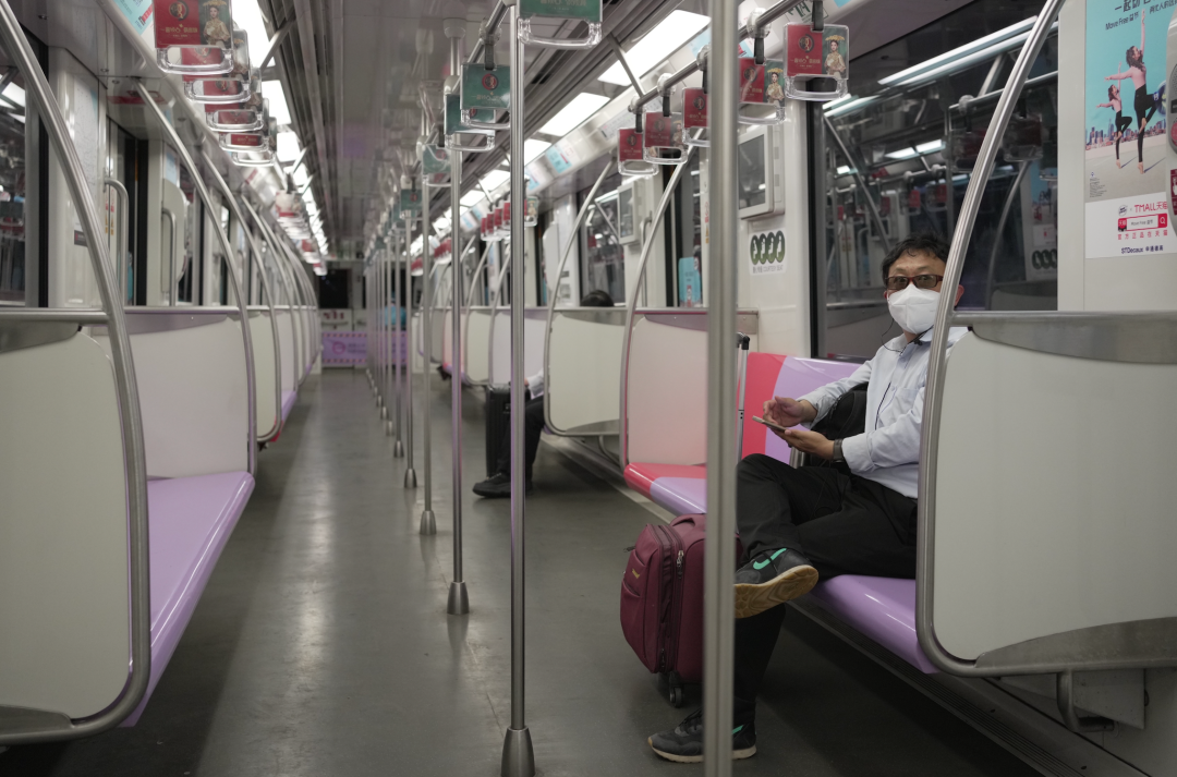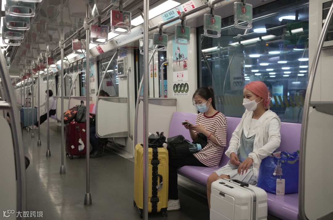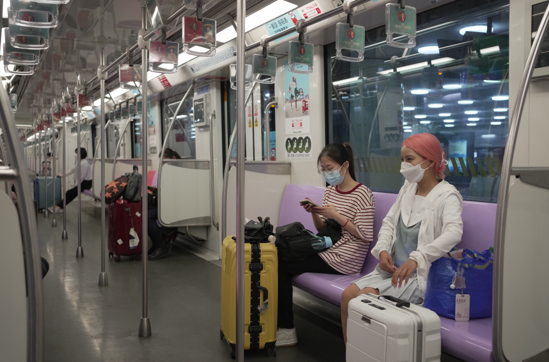 上海正进入疫情常态化防控转换阶段,5月22日起,首批4条轨道交通和273条地面公交线路恢复运行。在前往虹桥火车站的地铁10号线上,一些人拎着行李箱,准备启程,离开上海。