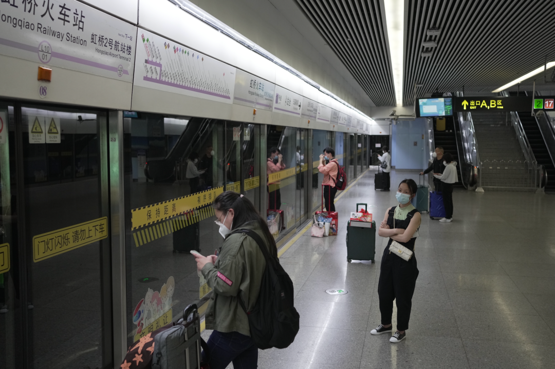 5月24日,乘客从上海虹桥火车站出站,在地铁10号线候车,准备乘轨道交通进入市区。中国日报记者高尔强拍摄