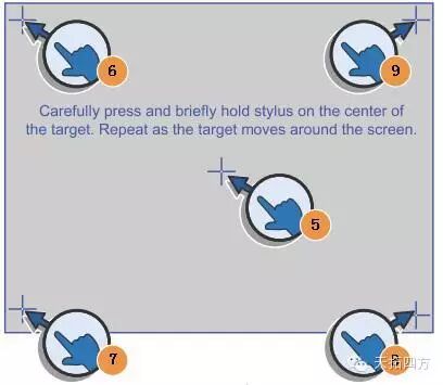 步骤5-9:首先使用触摸笔或者手指触摸屏幕画面中数字 5 位置的十字图标中心,然后十字图标会依次出现在屏幕 画面中 6-9 的位置,按照出现顺序依次触摸十字图标 中心。