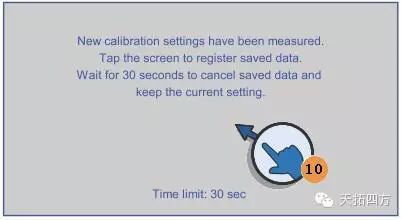 步骤10: 触摸完各个位置上的十字图标后,将出现以下对话框。必须在 30 秒内单击屏幕任意处,进行校准设置保存。