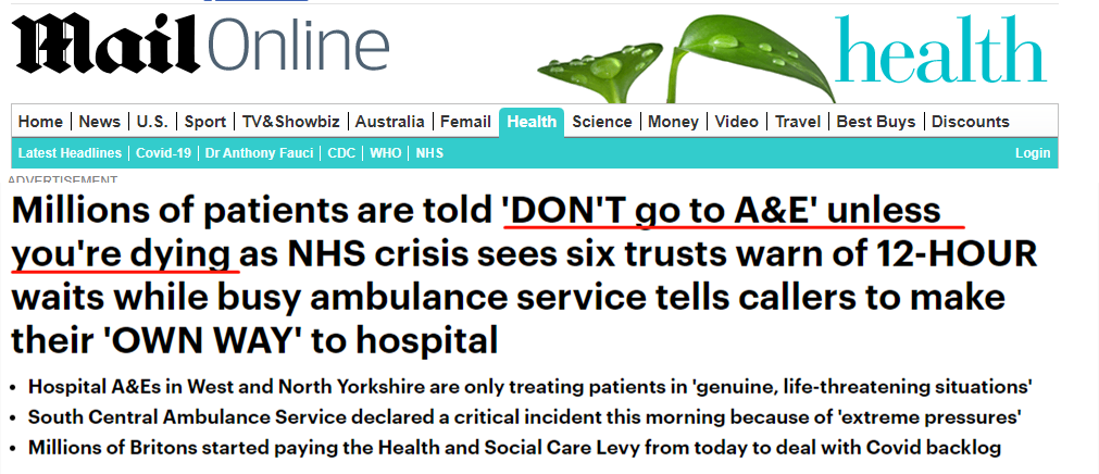 In the UK, the British hospitals are warning people to stay away because of the COVID stress. And millions of patients are told "do not go to A&E" because of the COVID stress. 在英国,各家医院已经告诫民众,由于新冠疫情压力陡增,尽量不要前往医院。更有数百万病人被告知不要去挂急诊。