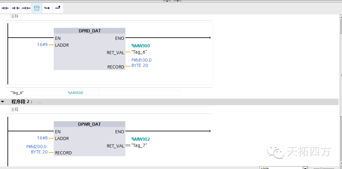 本例中从变频器逆变单元读取上来的数据,存储在MB100-MB120中,MB200-MB220中的数据将写入变频器逆变单元。控制单元及电机模块通讯与逆变单元类似。如果用户需要更多TIA博途软件的了解和使用,请联系天拓四方,我们也会更好的提供相关技术支持。