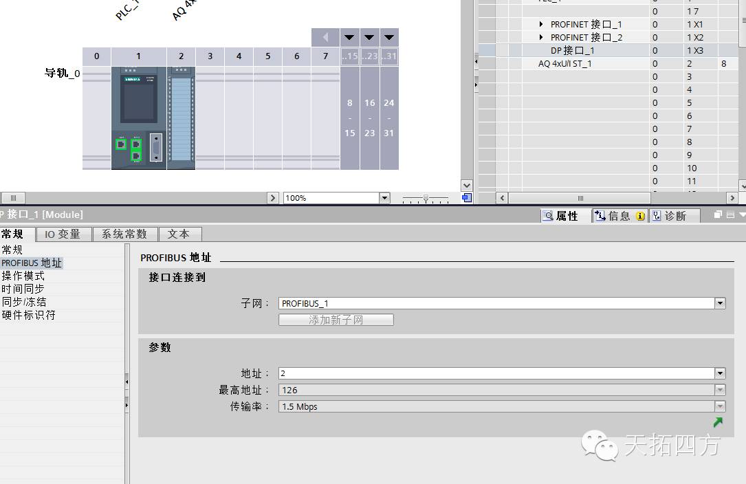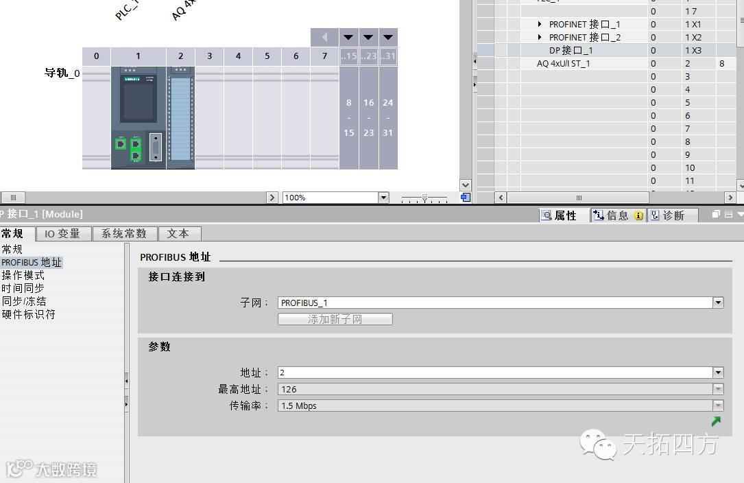 点击CPU上的 DP接口,在属性页面的参数页设置CPU的DP接口地址为2。