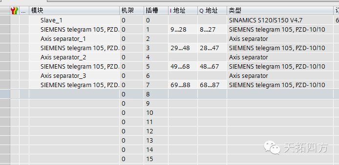 特别注意:由于S120为多传设备,所以在控制单元通讯字与整流单元控制字之间及电机模块控制字之间需要加入Axis separator 模块用来分隔控制单元、逆变模块、电机模块的通讯控制字。