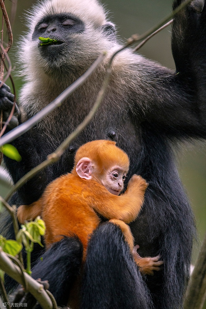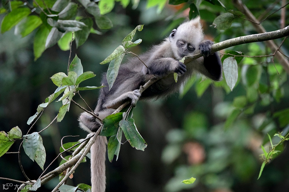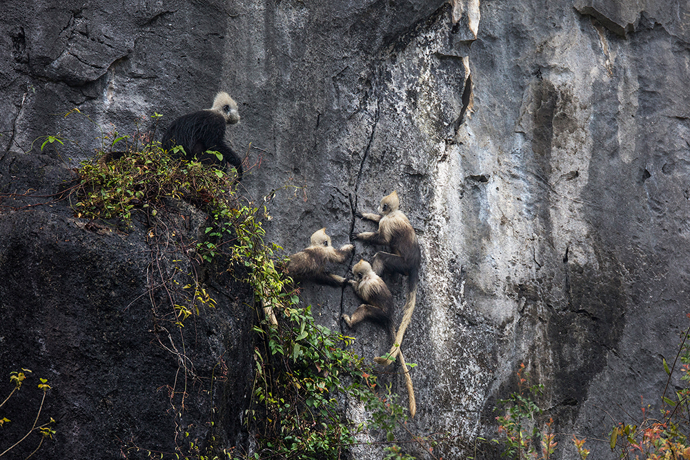 它们以猴群为社会基本结构,新生的白头叶猴全身呈金黄色,之后逐渐长成白头、白肩、长尾巴的模样。