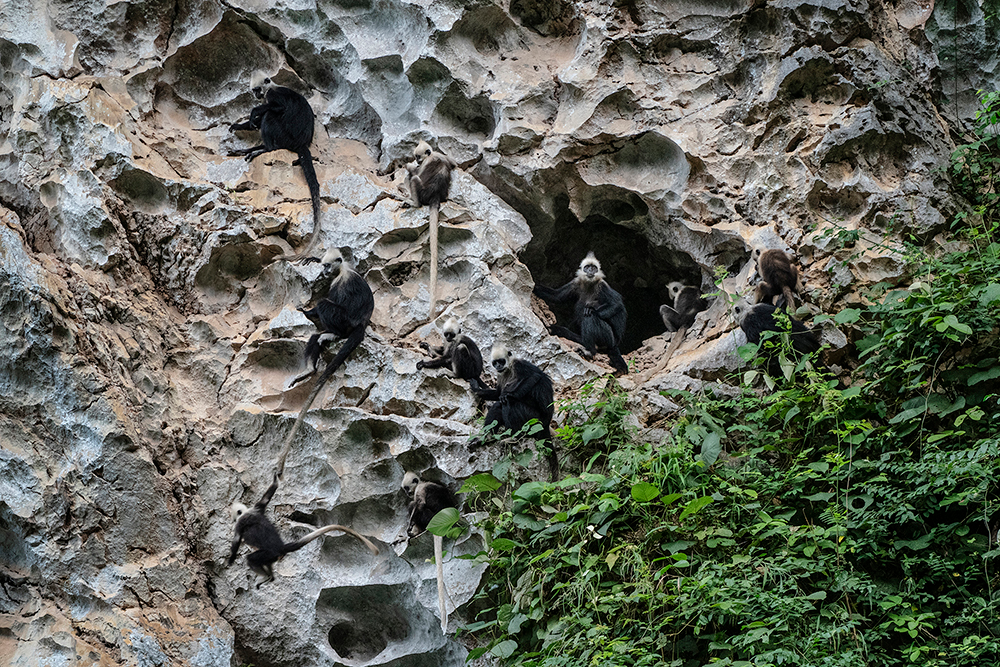Characterized by the white hair on their heads, white-headed langurs are found in the karst hills between the Zuojiang and Mingjiang rivers in the city of Chongzuo, Guangxi.