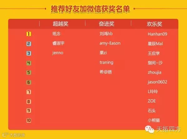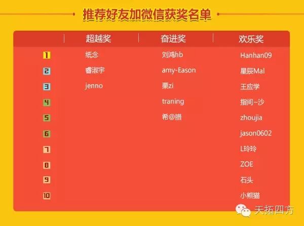 好消息来了,“推荐好友加天拓四方微信,各种给力豪奖免费寄回家”微信活动中奖名单公布啦!抱歉让大家久等了!小编不是有意卖关子的,而是如此隆重热烈喜庆的场面,必须浓妆艳抹才能珠联璧合、蓬荜生辉啊!