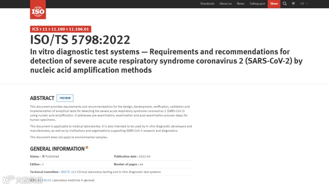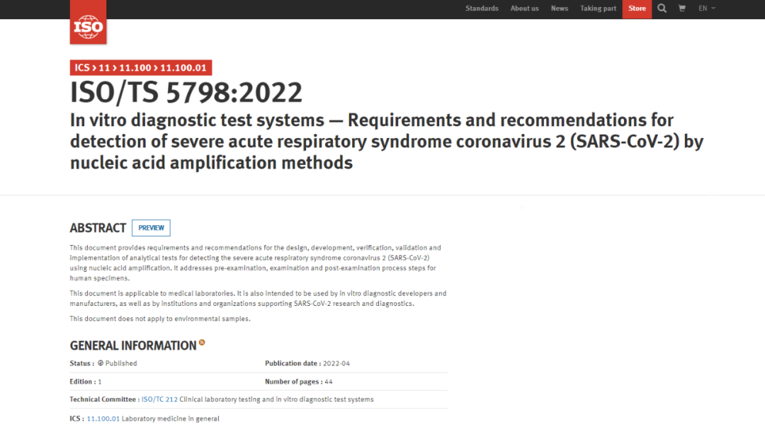 4月19日,国际标准化组织(ISO)发布了《体外诊断检验系统—核酸扩增法检测严重急性呼吸系统综合征冠状病毒 2(SARS-CoV-2)的要求及建议》(ISO/TS 5798:2022)国际标准。