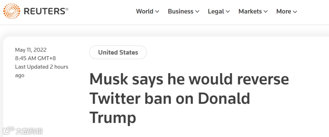 “我不会再用推特了。我希望马斯克收购推特,因为他会对推特加以改进,他是个好人,但我将使用属于我的发声平台‘Truth Social’”。