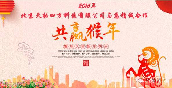 感谢您对天拓四方一直以来的合作与支持,您的信任和支持,是我们最宝贵的财富,2016年新春佳节来临之际,北京天拓四方科技有限公司(陕西华恒伟业、河南众智新融)总经理杨总携公司全体同仁给您以最诚挚的祝福,预祝您新年阖家欢乐!财源广进!万事如意!