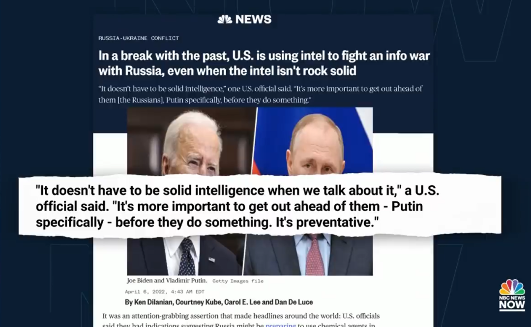 美国全国广播公司(NBC)国家安全领域记者肯·迪拉尼安(Ken Dilanian)日前在节目中披露,美方散布的有关俄乌冲突的信息并非全部“可靠”,有三名美国官员承认,美方没有证据表明这些消息的真实性便将其公布,目的就是为了让美方赢得一场针对俄罗斯的“信息战”。