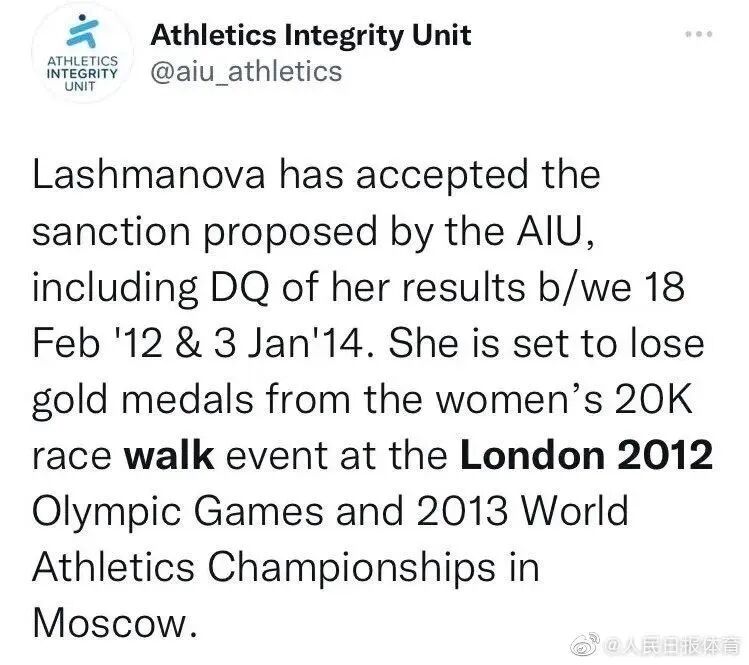 3月21日,国际田联诚信委员会通报,俄罗斯女子竞走选手拉什马诺娃因为服用禁药被禁赛两年,她在2012年伦敦奥运会20公里竞走比赛中打破世界纪录并获得的金牌被取消。获得银牌的另外一位俄罗斯名将卡尼斯金娜在2015年的样品重检中被查出阳性也被取消了奖牌。