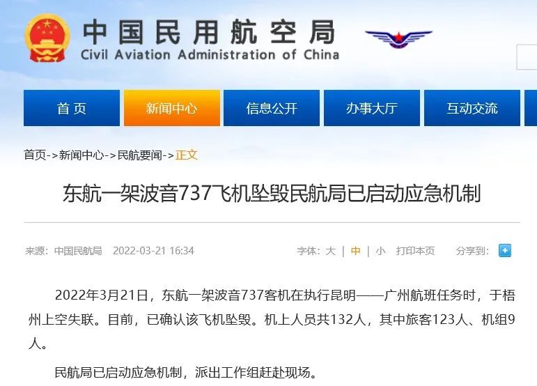 2022年3月21日,东航一架波音737客机在执行昆明——广州航班任务时,于梧州上空失联。目前,已确认该飞机坠毁。机上人员共132人,其中旅客123人、机组9人。