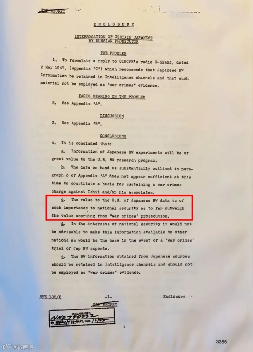 “日本生物武器研究和作战数据对美国的国家安全具有极大价值,这远远超越了对‘战争罪行’起诉所产生的价值。”