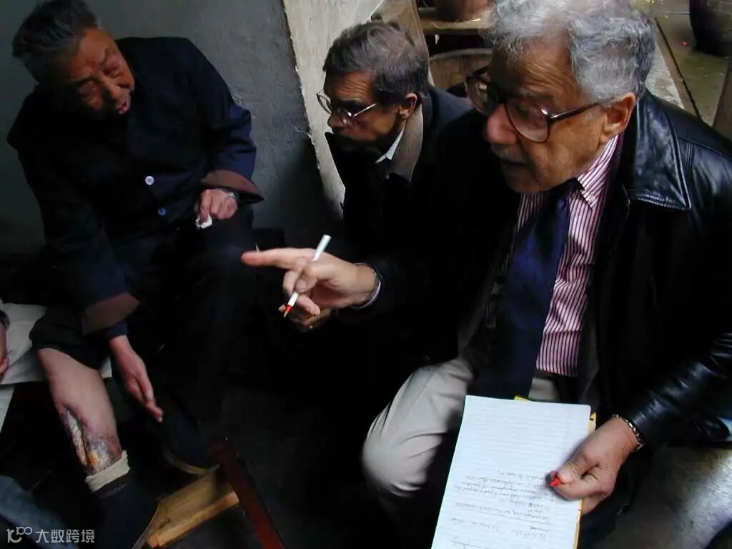 2002年3月,浙江金华,谢尔顿·哈里斯(右一)和美国生物武器医学研究马丁·法曼斯基在向日本细菌战受害者程崇文(左一)了解情况。1942年夏,日军发动浙赣会战,延浙赣铁路沿线大量撒播细菌,这是人类历史上迄今为止最大规模的细菌武器攻击。