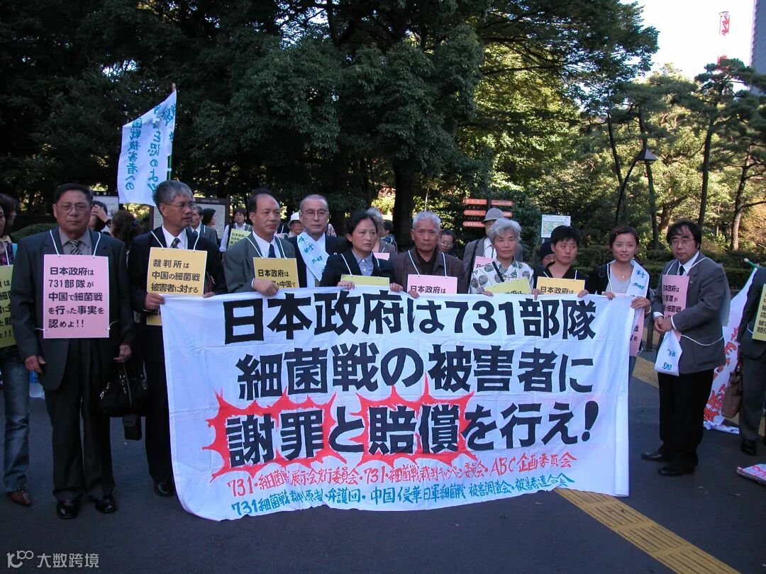 2003年9月,王选(右六)与日本律师及和平爱好者在东京都日比谷公园举行示威,要求日本政府就对中国发动细菌战进行道歉和赔偿
